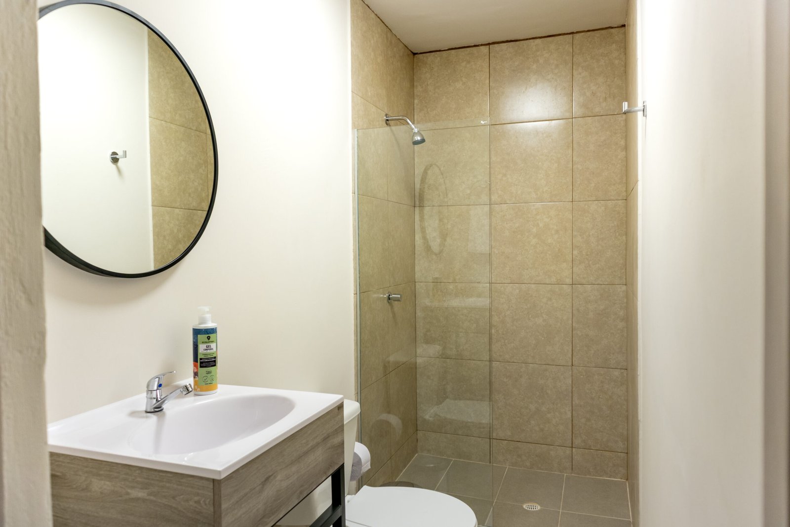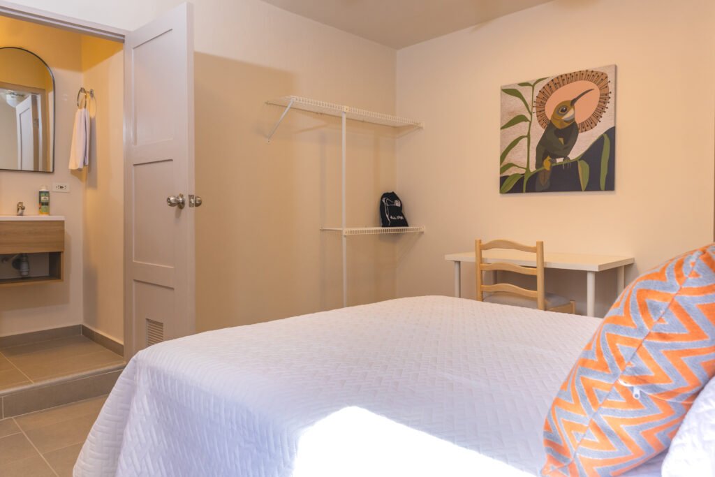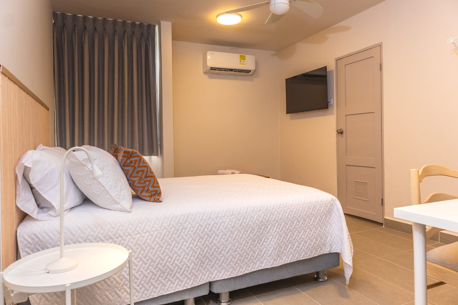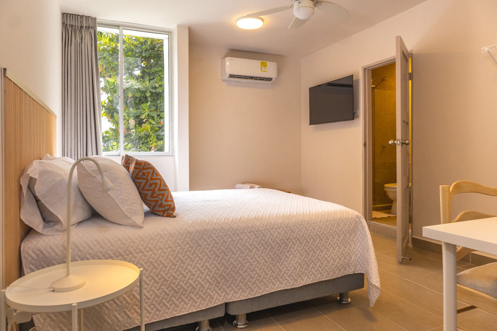 Habitaciones acogedoras y funcionales, con todo lo esencial para descansar cómodamente: cama doble, escritorio de trabajo, aire acondicionado, ventilador de techo, baño privado, secador de cabello, luz natural y amenities incluidos.
